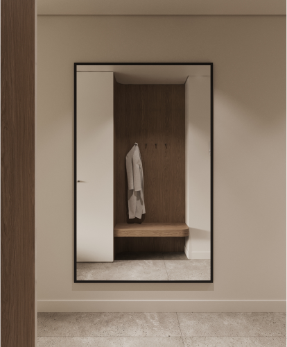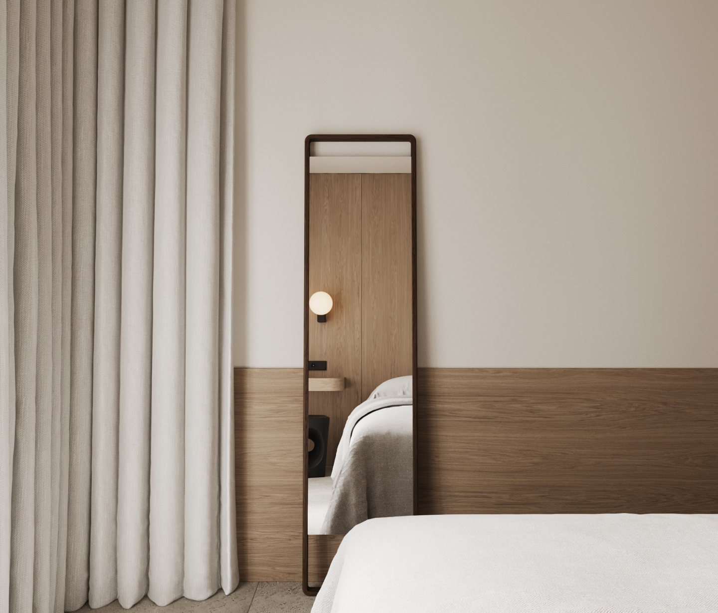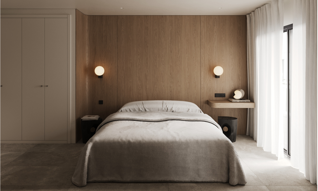 Restrained, natural, not too bright, complex colors and wooden custom furniture with soft streamlined lines create a calming, enveloping atmosphere.
