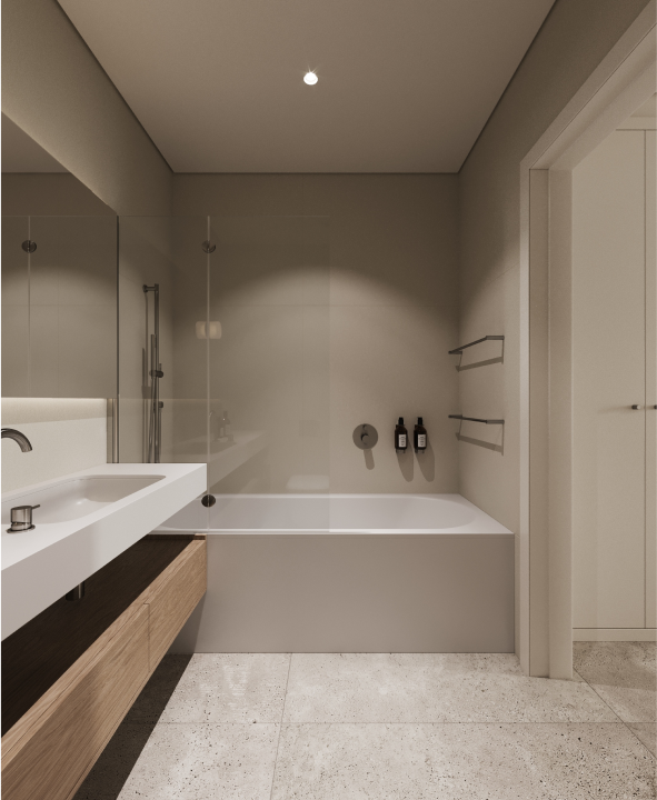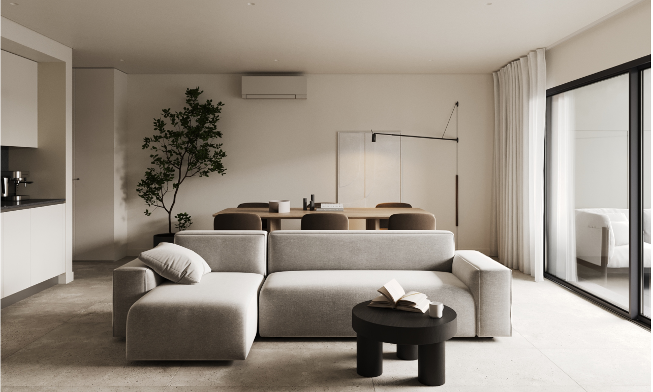 This space is inspired by the allure of resort living, uncluttered with clean lines and natural materials.