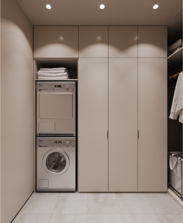 We chose a calm rage of colors as the unifying background for the space. We emphasized the warmth and monochrome of the main surfaces with dark graphic lines of lamps, accessories and furniture elements.